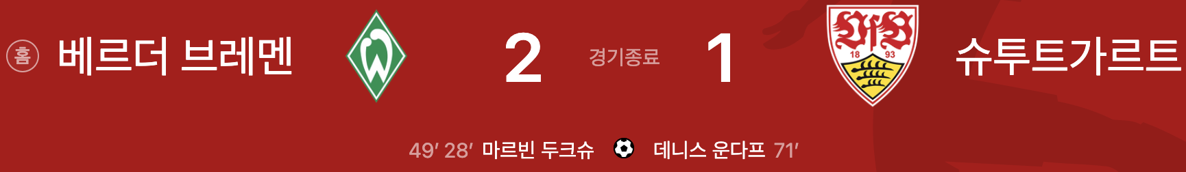 베르더 브레멘 2 vs 1 슈투트가르트
