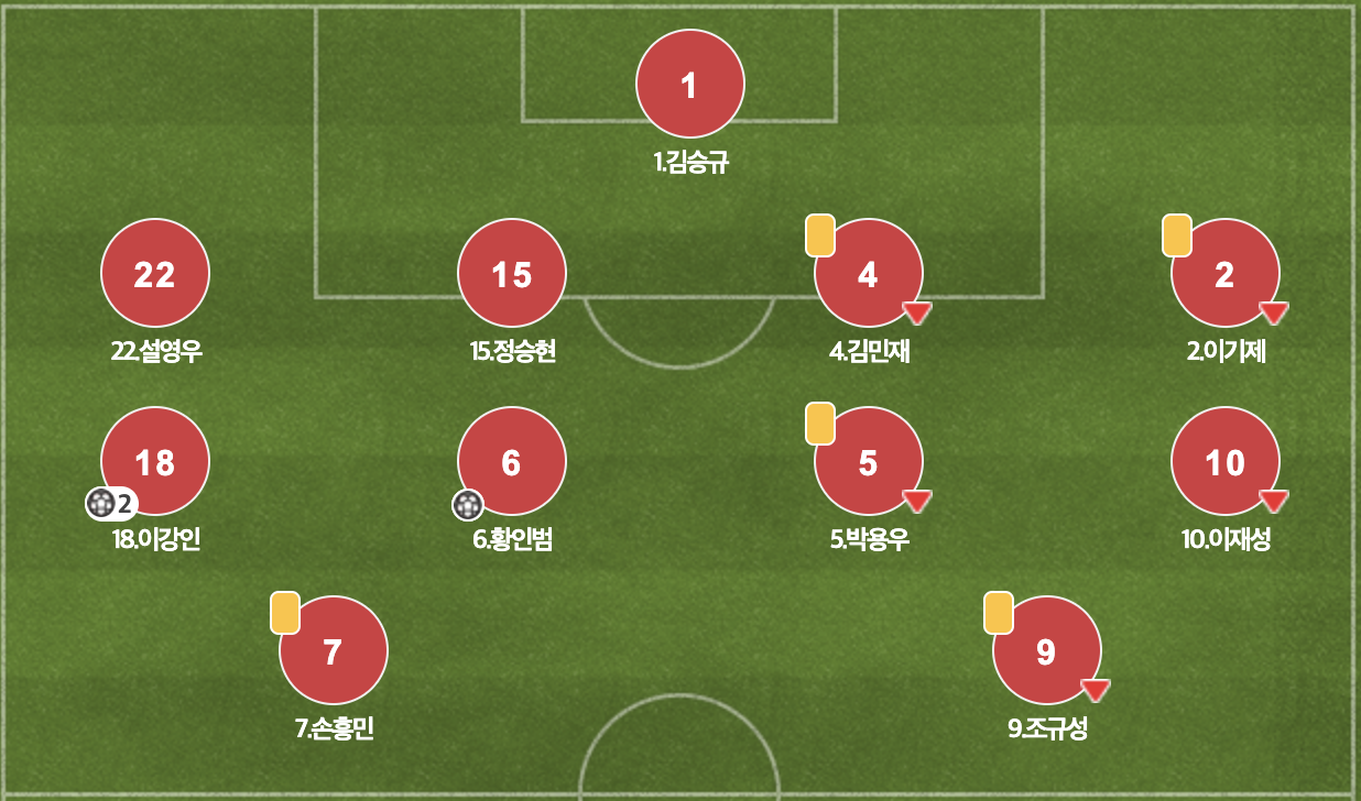 - 교체 투입 : 김태환(이기제), 홍현석(조규성), 김영권(김민재), 정우영(이재성), 박진섭(박용우)
