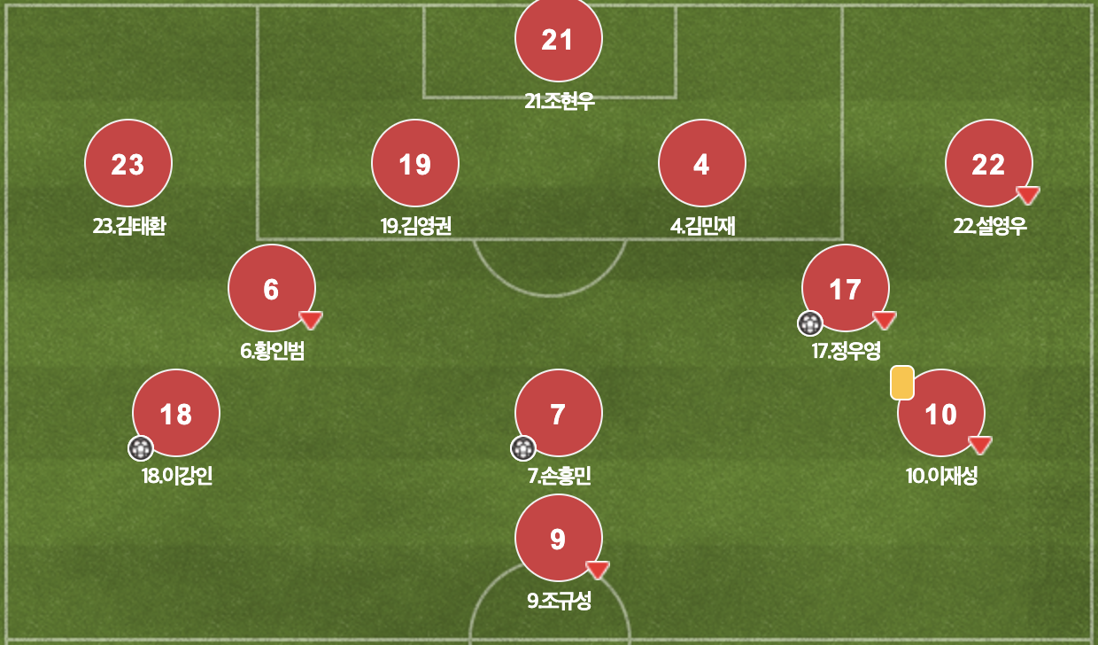- 교체 투입 : 홍현석(황인범), 황희찬(조규성), 오현규(정우영), 김진수(설영우), 박용우(이재성)