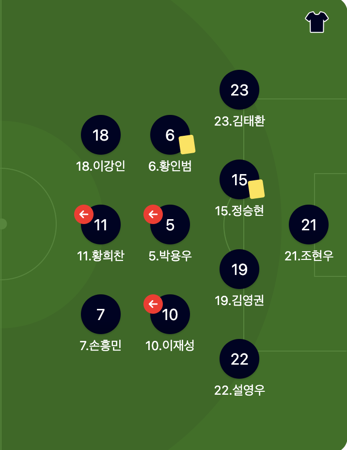 - 교체 투입 : 조규성(박용우), 양현준(황희찬), 정우영(이재성)