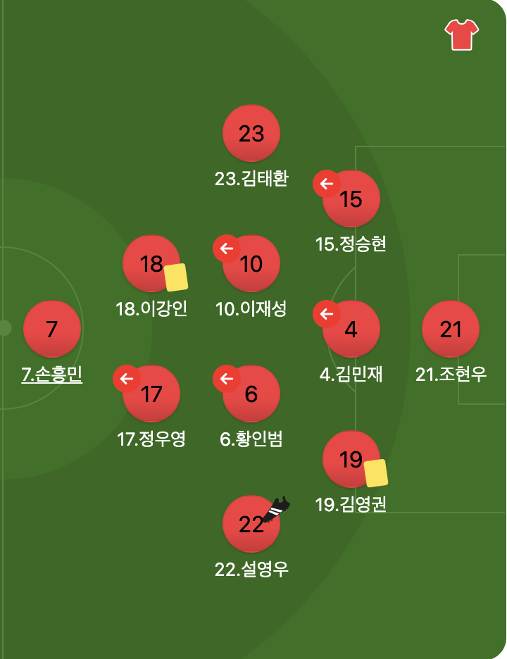 - 교체 투입 : 황희찬(정우영), 조규성(이재성), 박용우(정승현), 홍현석(황인범)